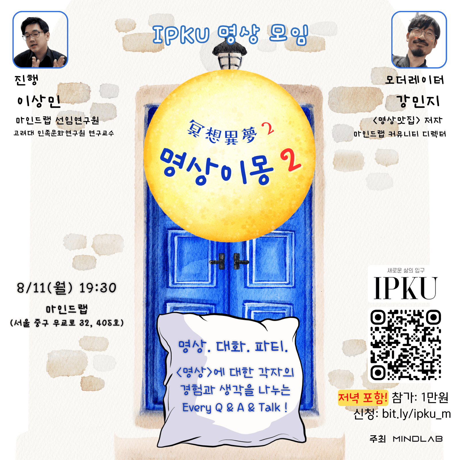명상에 대한 소소한 수다를 나눌 수 있는 모임입니다. 원래 1회성으로 하려고 했는데, 내용과 반응이 좋아서 바로 2탄을 준비했구요^^ 명상에 대해 궁금했던 점이 있다면 원없이 질문하시고, 각자의 명상 경험들을 가감없이 나누며, 참석한 모든 분들의 다양한 질문과 답과 이야기들을 즐겁게 공유해요.
