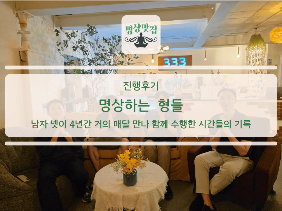 첫 번째 이야기는 명상맛집이 4년간 함께했던 명상하는 형들의 시즌1 종료 소식입니다. 4명의 남자들이 4년간 거의 매달 만나고 수행하며 함께 성장했어요.